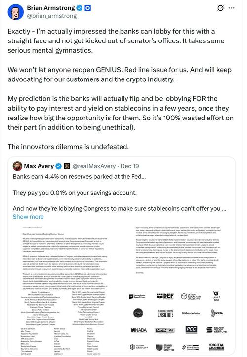 Coinbase CEO warning against reopening the GENIUS Act. Source: Brian Armstrong