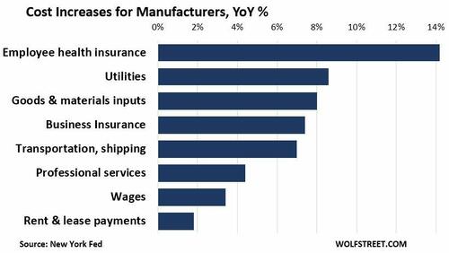 Manufacturers reported that the costs of health insurance for employees shot up by 14.2% on average; service firms reported an average increase of 12.9%, according to a report by the New York Fed based on a survey of companies in the New York-Northern New Jersey region.