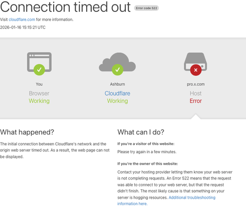 At around 10:10 ET, X went down, displaying a “connection timed out” message, suggesting an issue on the Cloudflare side.