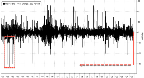 Shares of Trex Company, best known for its wood-alternative composite decking, plunged the most since the Dot Com bust in premarket trading after the company’s fourth-quarter net sales forecast came in below Bloomberg Consensus estimates. Analysts warned that soft consumer spending trends and a deteriorating home-improvement backdrop are weighing on demand.