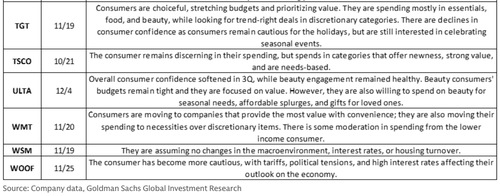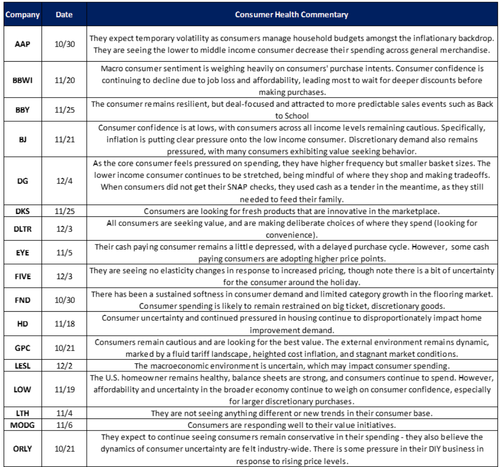 All commentary below from retailers reinforced the picture of a bifurcated consumer, with lower- and middle-income households tightening, value retailers benefiting from trade-downs, and discretionary or larger-ticket categories seeing demand slowdowns.