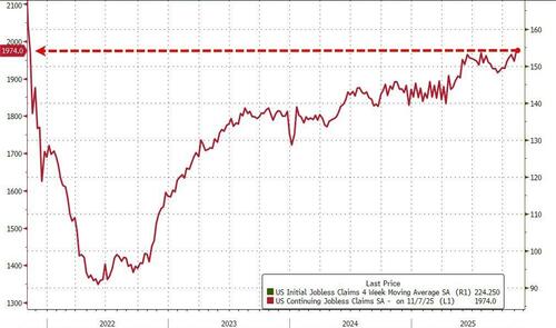 However, while initial claims remain solid, continuing jobless claims drifted higher to 1.974 million Americans – the highest level since October 2021…