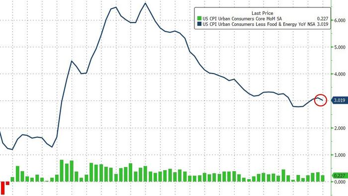A similar pattern was seen in Core CPI data with the print rising 0.2% MoM (below expectations of +0.3%), but pulled the YoY print down to 3.0% (down from 3.1% in August), the lowest since June…