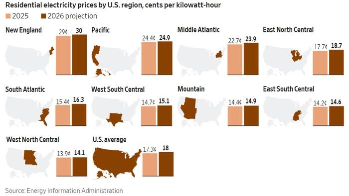 According to the Wall Street Journal, electricity prices have risen meaningfully across much of the country since 2022, and the drivers extend well beyond the frequently cited surge in data-center demand.