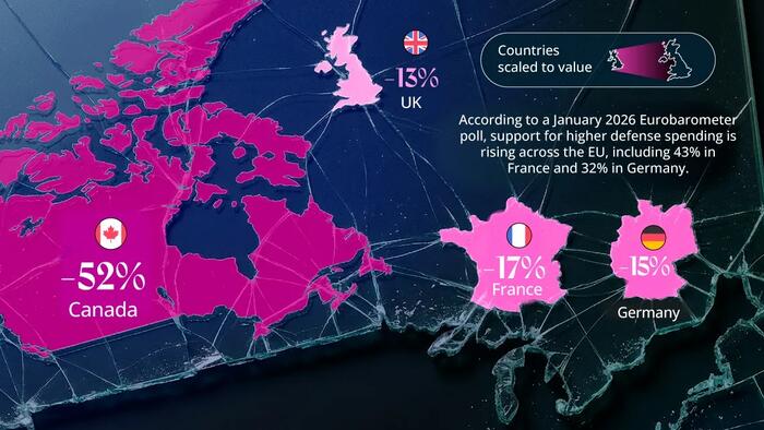 Germany and Japan also show meaningful declines at -15% and -16%. The United Kingdom is down -13%. These are not isolated moves. They point to weakening confidence across long-standing partnerships.