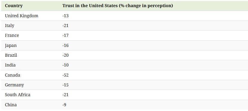 Among traditional allies, the drop in trust is sharp. Canada records the steepest decline at -52%. Italy follows at -21%. France stands at -17%.