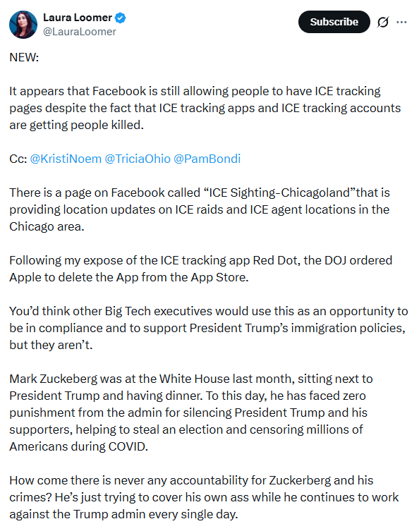 Then Laura Loomer — a person whose entire public identity was built around suing Facebook and other tech companies for moderating her own posts, and who once argued that content moderation was literal RICO — tagged Pam Bondi and Kristi Noem in a social media post demanding they do something about the Chicagoland group. Because apparently the First Amendment only constrains Meta when Loomer herself is being moderated; when she wants other people silenced, she calls in the actual federal government.