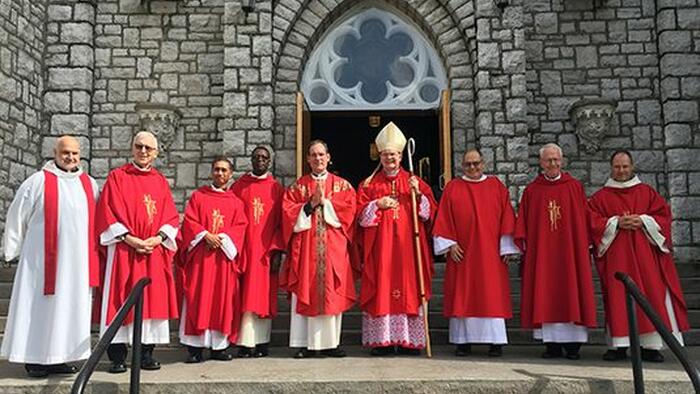 Clergy stand outside of the Martyrs’ Shrine in Ontario, Canada