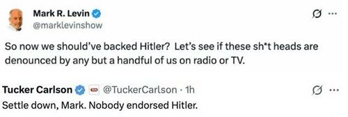 The bolded line is the most important. “And maybe there wouldn’t have been a Holocaust.” How in the world is that antisemitic? Considering the possibility that a different U.S. policy could have stopped the murder of Jewish people equates to Jewish hate? How dumb does Levin think his followers are?… So settle down, Mark. Nobody endorsed Hitler. And you know it.