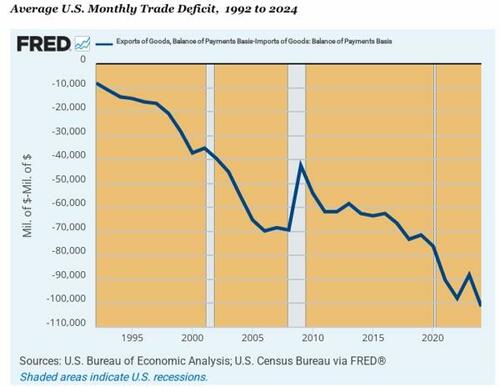 The USA has priced itself out of the global manufacturing market, which is exactly why America has been running chronic and massive trade deficits that reached the staggering annual level of $1.2 trillion in 2024. Indeed, the collapse of America’s trade balance has been relentless over the last 30 years, with the deficit rising by 10X, from $10 billion to $100 billion. Per month!
