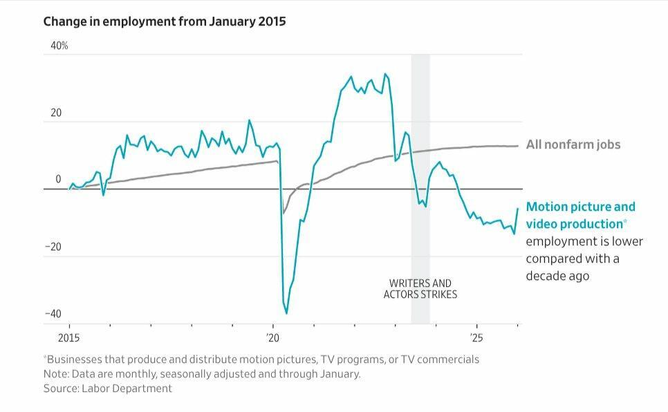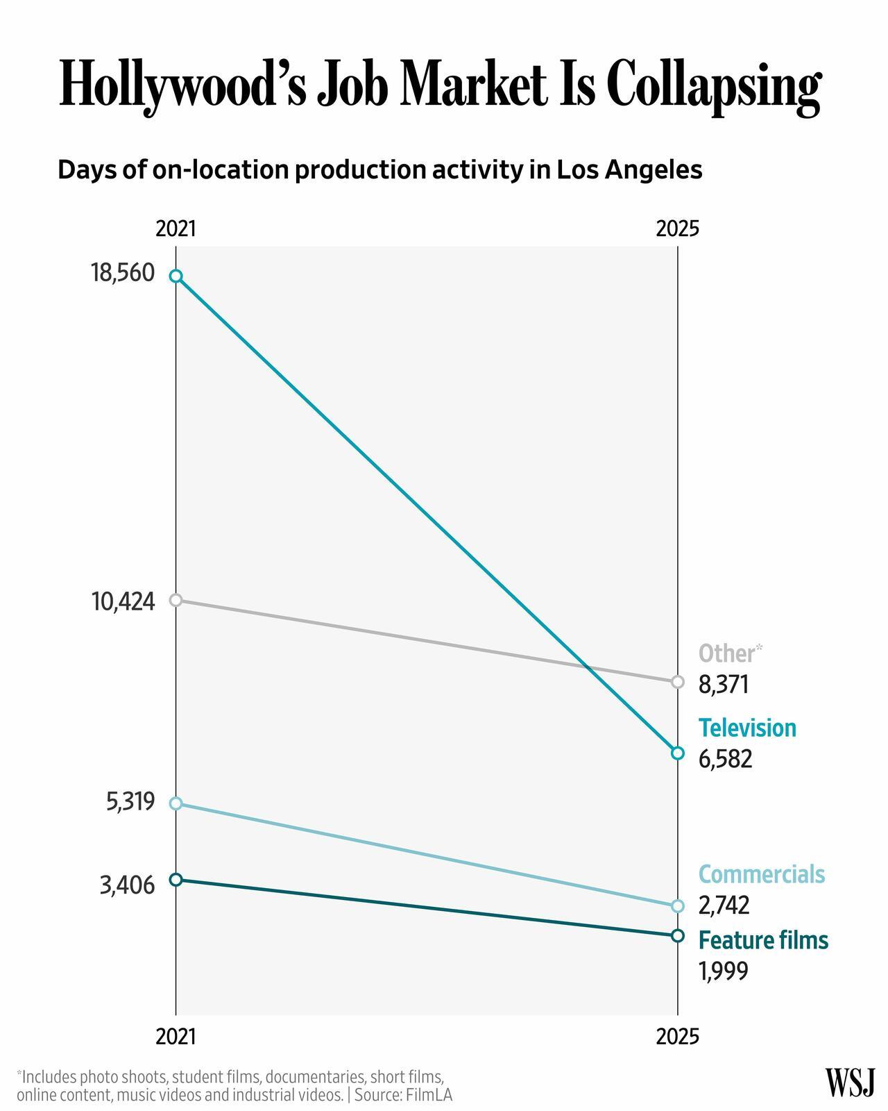 A new Wall Street Journal report describes the Hollywood job market as being in “collapse” mode, with employment in the industry down 30% from its late-2022 peak, while behind-the-scenes union workers logged 36% fewer hours last year than in 2022.