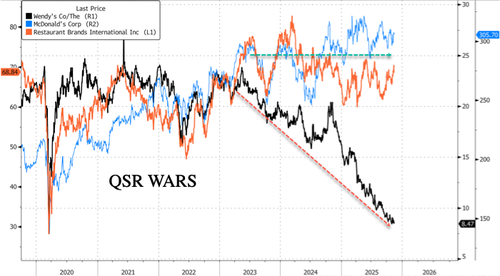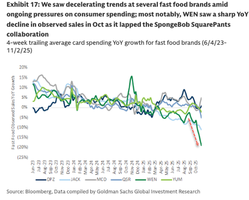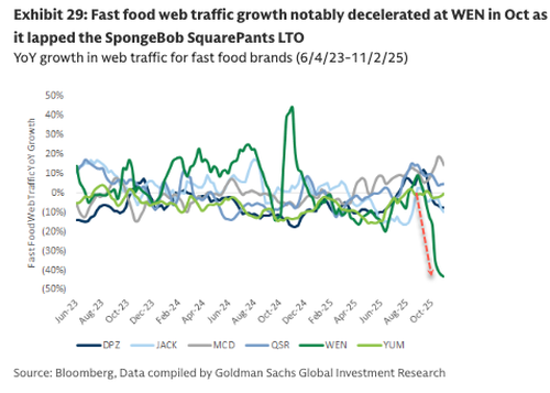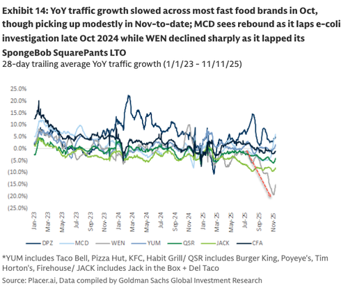 Expanding on the traffic slowdown, Goldman analysts led by Christine Cho cite Placer.ai location data showing that Wendy’s foot traffic sharply deteriorated since mid-summer and collapsed this fall. This data is based on anonymized real-world mobile-device signals.