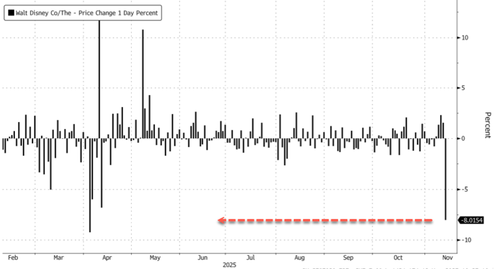 Disney posted uninspiring fourth-quarter revenues, flat at about $22.5 billion and below the Bloomberg consensus estimate of $22.8 billion. Adjusted EPS beat at $1.11 versus the $1.07 expected. The miss sent shares in New York down 8% in the cash session, the largest intraday decline since April 3. The company also warned about softening across its entertainment unit.