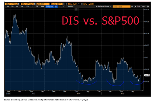 DIS: chart of Disney vs S&P5000 .. stock has been bouncing around / off the lows on a relative basis with bulls arguing the R/R is attractive from low-100s levels (vs bears argue too many moving parts in a complex macro backdrop)