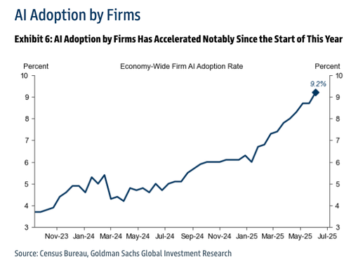 Building on a recent Goldman report, the current adoption rate stands at roughly 9.2% economywide. Skeptics like Elliott Management have called this AI cycle “overhyped.”