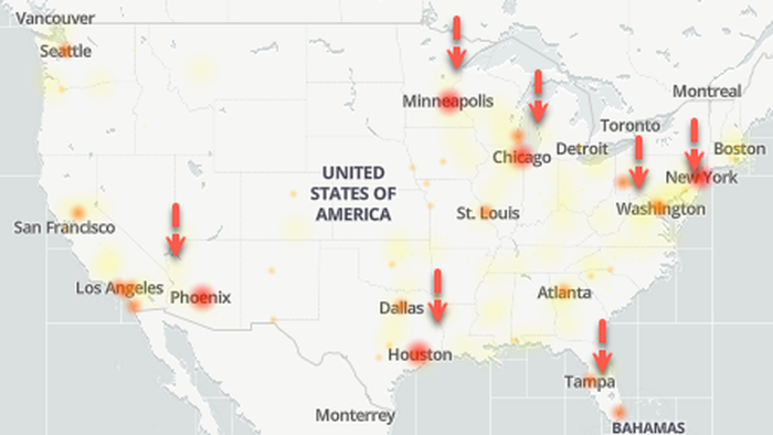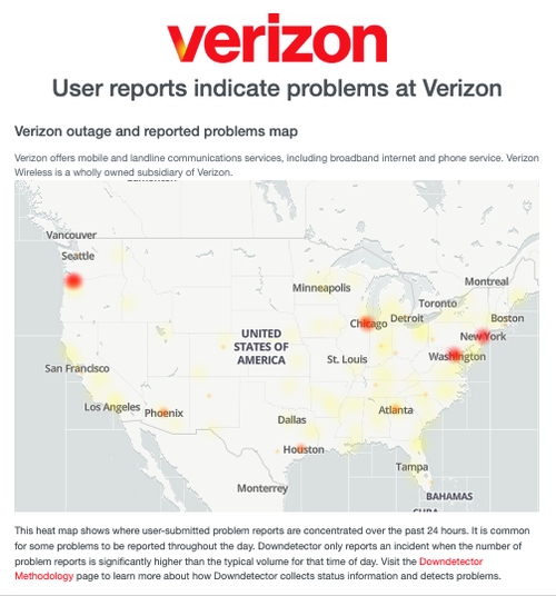 At a more granular level of the Verizon outage, reports indicate that outages and disruptions are being logged across the Washington-Baltimore region, New York, Chicago, Atlanta, Houston, and areas near Seattle.