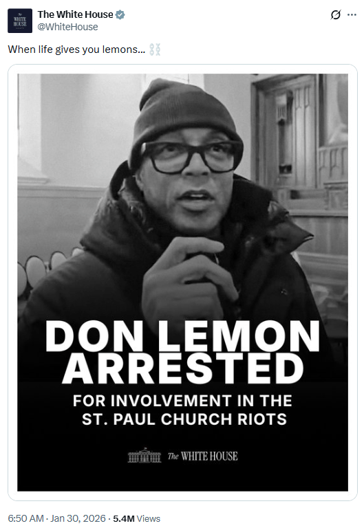 It’s not just Davis and Dhillon joyfully cheering on this blatant attack on the First Amendment. The White House itself posted a black and white photo of Don Lemon cheering on his arrest, calling it (ridiculously) the “St. Paul Church Riots” (there were no riots) and tweeting “When life gives you lemons…” along with chain emojis.