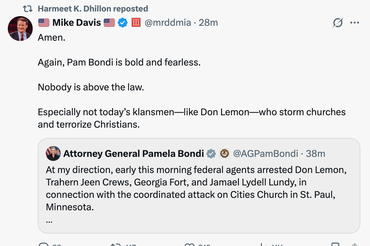 Both arrested journalists are Black. The head of the DOJ’s “civil rights division,” Harmeet Dhillon, celebrated by retweeting Republican operative Mike Davis calling Lemon “a klansman.”