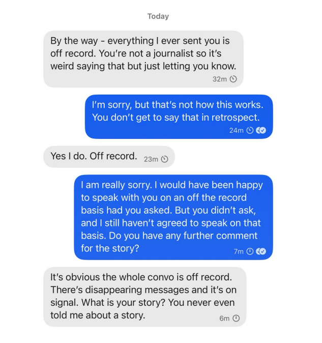 Halligan: It’s obvious the whole convo is off record. There’s disappearing messages [this is setting that Halligan set, btw] and it’s on signal. What is your story? You never even told me about a story.