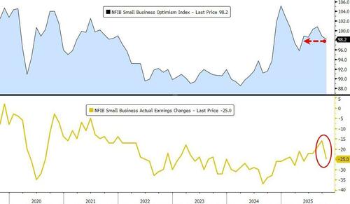 The National Federation of Independent Business optimism index declined 0.6 point to 98.2, according to figures released Tuesday. Five of the 10 components that make up the gauge decreased while four improved.