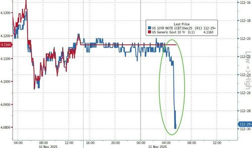 Cash bonds are closed for Veterans Day but futs signal a drop of about 4bps for the 10Y yield…