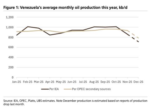 We see ambiguous but modest risks to oil prices in the short-run from Venezuela depending on how US sanctions policy evolves. We estimate 2026 Brent averages of $58/54 in scenarios where Venezuela crude production declines/rises by 0.4mb/d by end-2026 (vs. our $56 baseline which assumes flat production of 0.9mb/d).