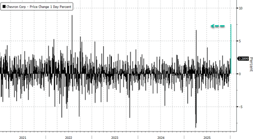 Chevron jumped as much as 10% in premarket trading in New York, with ConocoPhillips up 5% and Exxon Mobil up 3%. If the roughly 7% gains for Chevron hold in the cash session, this would mark the company’s largest daily increase since late summer 2022.
