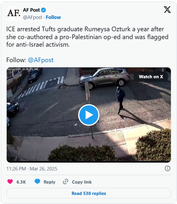 That very disturbing scene seemed like something out of a Hollywood film chronicling the actions of a dystopian American police state, and that initial impression was only solidified once media reports explained why Rumeysa Ozturk was snatched off the streets of her home town. Her only reported transgression had been her co-authorship of an op-ed piece in the Tufts student newspaper a year earlier sharply criticizing Israel and its ongoing attacks on the civilian population of Gaza.
