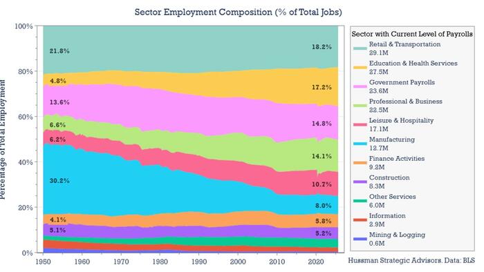 And now some bad news for the formerly well paid workers in the Professional & Business Services sector, which had grown from 6.6% of total jobs in 1950 to 14.1% today. ChatGPT and the avalanche of AI tools are eliminating jobs in these sectors at hyperbolic speed. These are the same assholes who used to tell blue collar workers to “learn to code”. Well, now the plumbers, electricians, and construction workers can recommend they learn to be fry cooks at McDonalds, but too late, robots are taking those jobs.