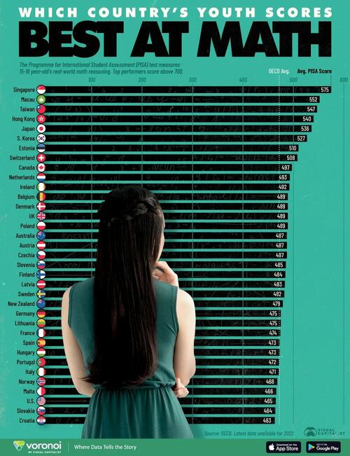 This infographic, via Visual Capitalist’s Bruno Venditti, ranks countries by their average math scores among 15โ16 year-olds.