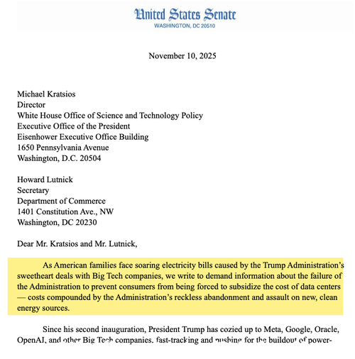 “As American families face soaring electricity bills caused by the Trump Administration’s sweetheart deals with Big Tech companies, we write to demand information about the failure of the Administration to prevent consumers from being forced to subsidize the cost of data centers — costs compounded by the Administration’s reckless abandonment and assault on new, clean energy sources,” the senators wrote in the letter.