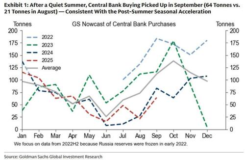 Goldman’s nowcast of central bank and institutional gold demand on the London OTC estimates September purchases at 64 tonnes (67 tonnes on a 12-month moving-average basis), up from 21 tonnes in August and consistent with the typical post-summer seasonal acceleration…