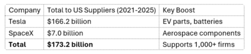 Musk doesn’t hoard; he spreads the wealth to US suppliers. Tesla alone dropped $166 billion on American vendors for batteries, chips, and steel—propping up factories in Michigan and Nevada. SpaceX, with its “buy American” ethos, added $7 billion, mostly for rocket-grade alloys and avionics from domestic shops. xAI Together, that’s $173 billion funneled to thousands of small and mid-sized firms, creating indirect jobs and steeling supply chains against global hiccups.