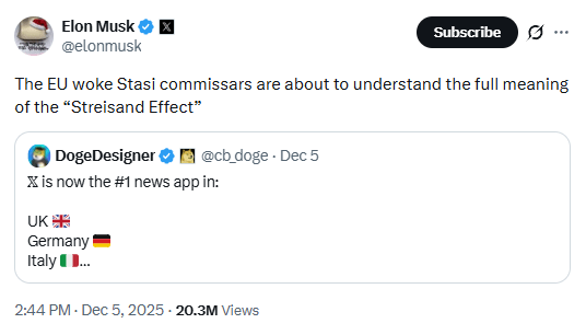 After that, Musk started threatening to punish EU Commissioners directly for the fine. In doing so he incorrectly references the Streisand Effect: