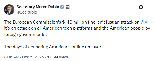 content moderationdsaElon MuskEUFeaturedfineFree SpeechJD VanceMarco Rubiotransparencytwitter