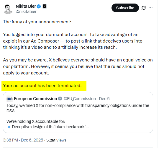 Then came the petty retaliation. First, he canceled the EU Commission’s X advertising account. X claimed it was because they “exploited” X’s ad platform by posting a link that appeared to be a video, but replies to that tweet suggested many, many people said that claimed “exploit” was not an exploit at all, but a tool that many others had used.