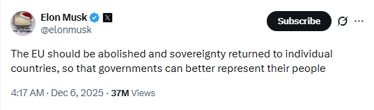 Of course, Musk isn’t just misrepresenting the fine. He’s responding with a series of escalating tantrums designed to feed his false censorship narrative. First, he called for abolishing the entire EU:
