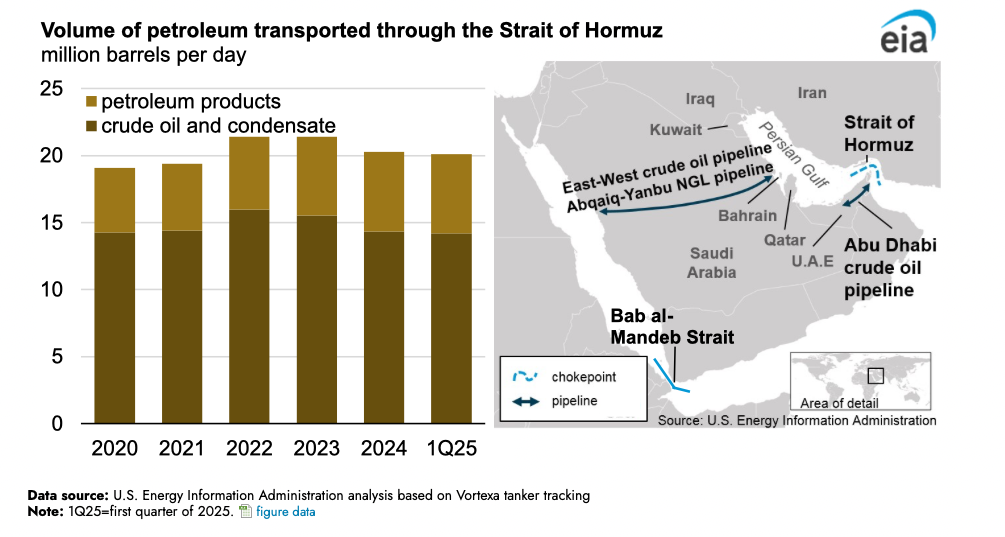 Iran controls the Strait of Hormuz, connecting the Persian Gulf, the Gulf of Oman, and the Arabian Sea, where 20% of the world’s oil moves through on large oil tankers. Saudi Arabia accounted for 38% of total oil flows through the strait at 5.5 million barrels per day, leading all other countries. About 20% of the world’s LNG trade goes through the strait, most of which comes from Qatar (about 9.3 million cubic feet per day in 2024).