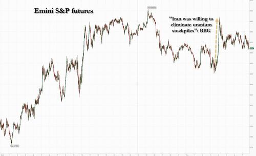 US futures are mixed, first dropping overnight to session lows after Iran vowed to escalate its retaliation against US strikes and avenge the US sinking of an Iranian warship as the conflict entered its sixth day, before spiking to session highs after Bloomberg reported that Iran had previously signaled a willingness to eliminate its uranium stockpiles in return for “something good” during talks with the US before the strikes began (although the remarks related to earlier negotiations, the headlines were enough to shift sentiment which however faded in the absence of a signal from Washington). As of 8:00am ET, S&P futures were down 0.2%, but off session lows; Nasdaq futures dropped 0.1% despite a 7% jump in AVGO shares after earnings with Mag7 lower. Cyclicals outperform Defensives led by Fins / Energy. Brent briefly pared an advance before resuming its climb above $83 a barrel amid increasing disruptions to energy markets from the war and after China was said to have told its largest refiners to suspend exports of diesel and gasoline. European stocks were little changed. A benchmark for Asian equities trimmed its rebound of as much as 3.8%. The dollar rose 0.2%, 10-year TSY yields rose for a fourth straight day, trading above 4.13%. Commodities are higher led by Energy; base leading precious metals and Ags have a mild bid. Arab states across the Persian Gulf reported interceptions of Iranian missiles and drones. Today’s macro data focus is on Challenger Job Cuts (pay attention to AI-induced layoffs) and Jobless Claims ahead of tmrw’s NFP / Retail Sales prints.