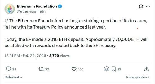According to a Tuesday post on X, the foundation deposited 2,016 Ether and plans to stake about 70,000 in total, with all rewards flowing back into its treasury to fund protocol research and development, ecosystem development and grants.