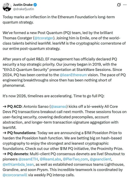 “After years of quiet R&D, EF management has officially declared PQ security a top strategic priority,” Drake said in a Saturday post on X. “It’s now 2026, timelines are accelerating. Time to go full PQ.”