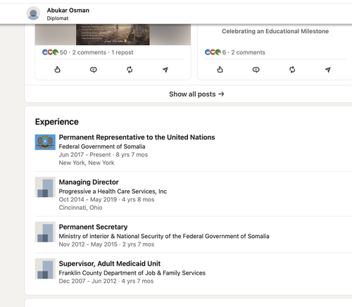 Ohio state corporate records show that Osman was listed as the statutory agent for Progressive Health Care Services Inc, a Cincinnati-based home healthcare company, while simultaneously serving as Somalia’s top diplomat at the United Nations.