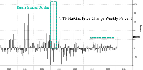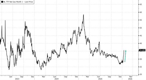 Dutch TTF natural gas futures, Europe’s benchmark gas contract, are up 25% on the week and on track for their largest weekly gain since October 2023. The abrupt reversal in sentiment reflects tightening storage levels, short covering, and a burst of unusually cold weather sweeping across the continent.