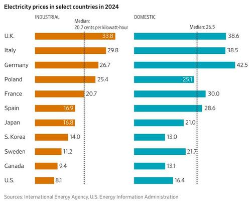 “Germany now has the highest domestic electricity prices in the developed world, while the U.K. has the highest industrial electricity rates, according to a basket of 28 major economies analyzed by the International Energy Agency. Italy isn’t far behind. Average electricity prices for heavy industries in the European Union remain roughly twice those in the U.S. and 50% above China.”