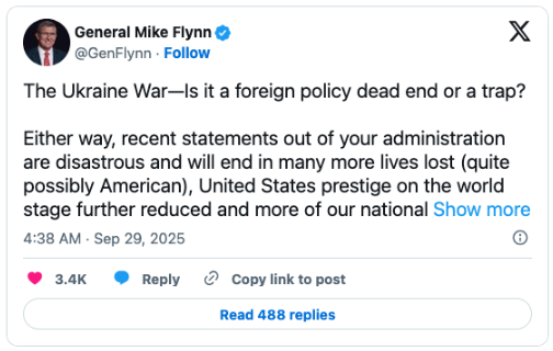 Regardless, Gen. Flynn is worried that his former boss is being led down a disastrous path. In a social media post on Monday, Flynn asked: “Is Ukraine is a foreign policy dead end or a trap?” He also said that someone near the president suggested that another nation’s leader be eliminated, presumably Russia’s. And he addressed Trump directly: “Donald Trump we want you to be the PEACE PRESIDENT.”