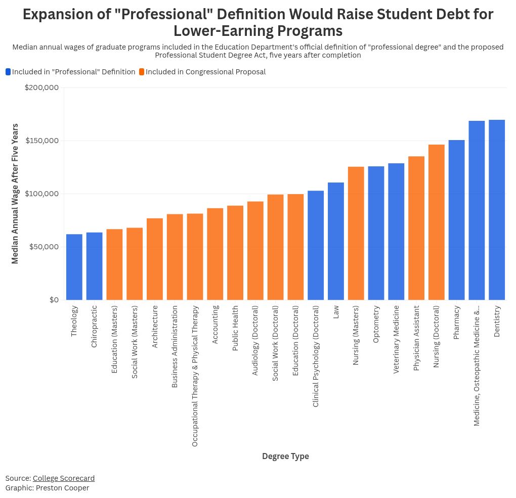 There are reasonable arguments for amending the current definition of “professional degree”—but in the opposite direction. Based on earnings data, theology programs should almost certainly not get access to higher loan limits; there’s a good case for dropping chiropractic and clinical psychology degrees as well. Broadening the definition to include advanced nursing and physician assistant programs might not be the end of the world, but it’s not really necessary, and Congress should be more focused on reducing student debt than expanding it.