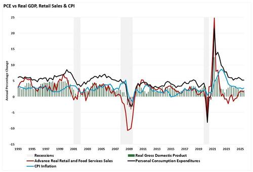 The retail sector provides early signals of demand weakness. Housing-related spending, auto sales, and discretionary purchases show stress, and many consumers face higher borrowing costs and lower savings. As shown, PCE, which accounts for nearly 70% of the GDP calculation, slowing inflation rates, and weak retail sales growth, all suggest that demand destruction is present in the economy. Such a development may further weigh on the Fed’s narrative of a soft landing.