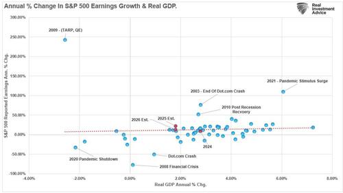 “A better way to visualize this data is to look at the correlation between the annual change in earnings growth and inflation-adjusted GDP. There are periods when earnings deviate from underlying economic activity. However, those periods are due to pre- or post-recession earnings fluctuations. Currently, economic and earnings growth are very close to the long-term correlation.”