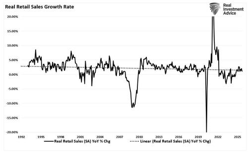 Wall Street’s forward expectations hinge on a growth rebound in 2026. Those projections assume that demand will return and margins will remain stable. However, there is no guarantee that either of those assumptions are accurate. If margins have already peaked, inflation declines as demand erodes, and employment falls, negative earnings revisions could be substantial. The year-over-year change in real retail sales, as shown in the chart, has hovered near recessionary warning levels. With consumers already strained by high debt service costs, weak wage growth, and declining savings, discretionary spending is under pressure, which directly affects earnings across cyclical sectors.