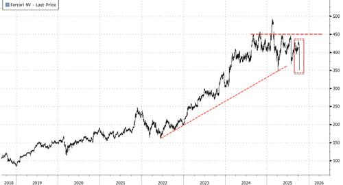 Shares of Ferrari NV crashed 16% in Milan trading, marking the biggest intraday decline since 2016, after the exotic carmaker delivered a cautious long-term outlook that fell short of Wall Street expectations. Analysts, including Tom Narayan’s team at RBC Capital Markets, said Ferrari’s updated 2030 guidance came in below consensus estimates. The cautious forecast comes as UBS warned last week that softness in U.S. consumer demand has spread from low-income to middle-income buyers.